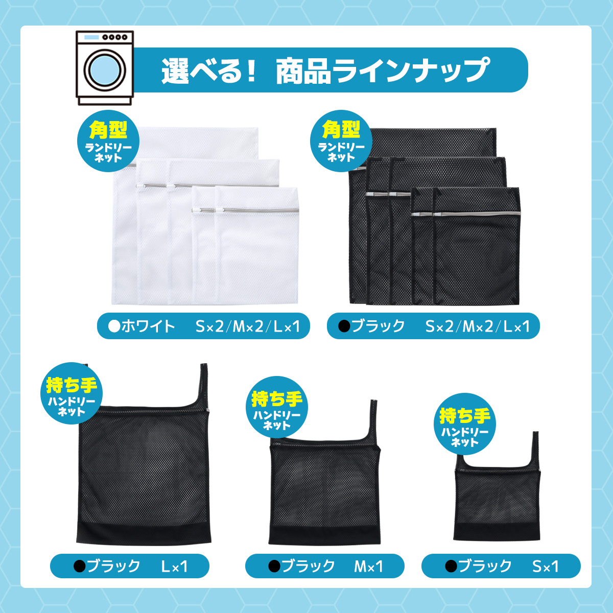 | メーカー希望小売価格 | ランドリーネット ホワイト:2480円、ブラック:2980円 ハンドリーネット Sサイズ:1,580円、Mサイズ:1,980円、Lサイズ:2,580円 |