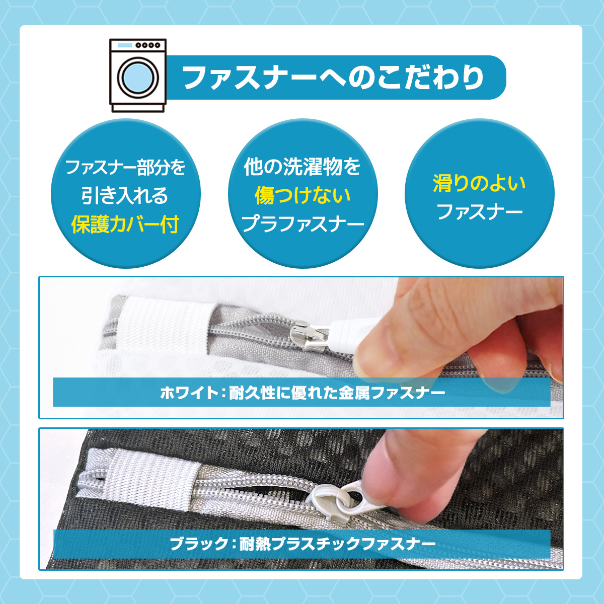 ファスナーと洗濯機の衝突も防ぎ、洗濯機の傷を低減することができます。