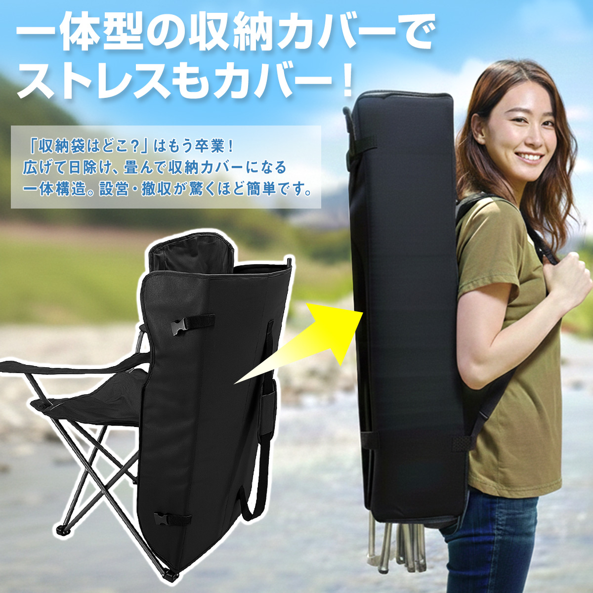 • 【畳んで持ち運びやすい】両手でフレームを広げるだけでスムーズに組み立てられ、フレームを束ねれば即座にコンパクト収納可能。収納時にはシェード部分が本体カバーの役割を兼ねており、ショルダーベルト付きなので持ち運びしやすいです。